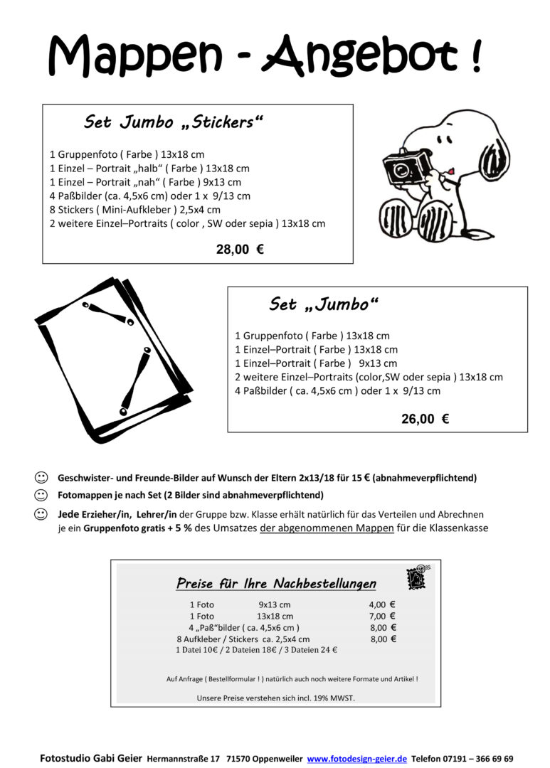 In Abstimmung mit der Einrichtung (z.Bsp. Kindergarten, Schule oder Hort) unterbreite ich Ihnen gerne ein individuelles Angebot für wunderschöne und einzigartige Foto-Mappen und liefere diese dann nach Fertigstellung persönlich aus. Liebevolle bleibende Erinnerungen an diese Zeit festzuhalten – ich freue mich darauf! Teilen Sie mir Ihre Terminwünsche zur Planung mit! Mappen-Sets ab 28 € inkl. Gruppenfoto, Portraits, Stickers und weitere Bilder-Sets auf Wunsch und Absprache natürlich auch mit Geschwisterbildern. Bei Abnahme der kompletten Mappe sind die Foto-Dateien digital zu einem Sonderpreis erhältlich!